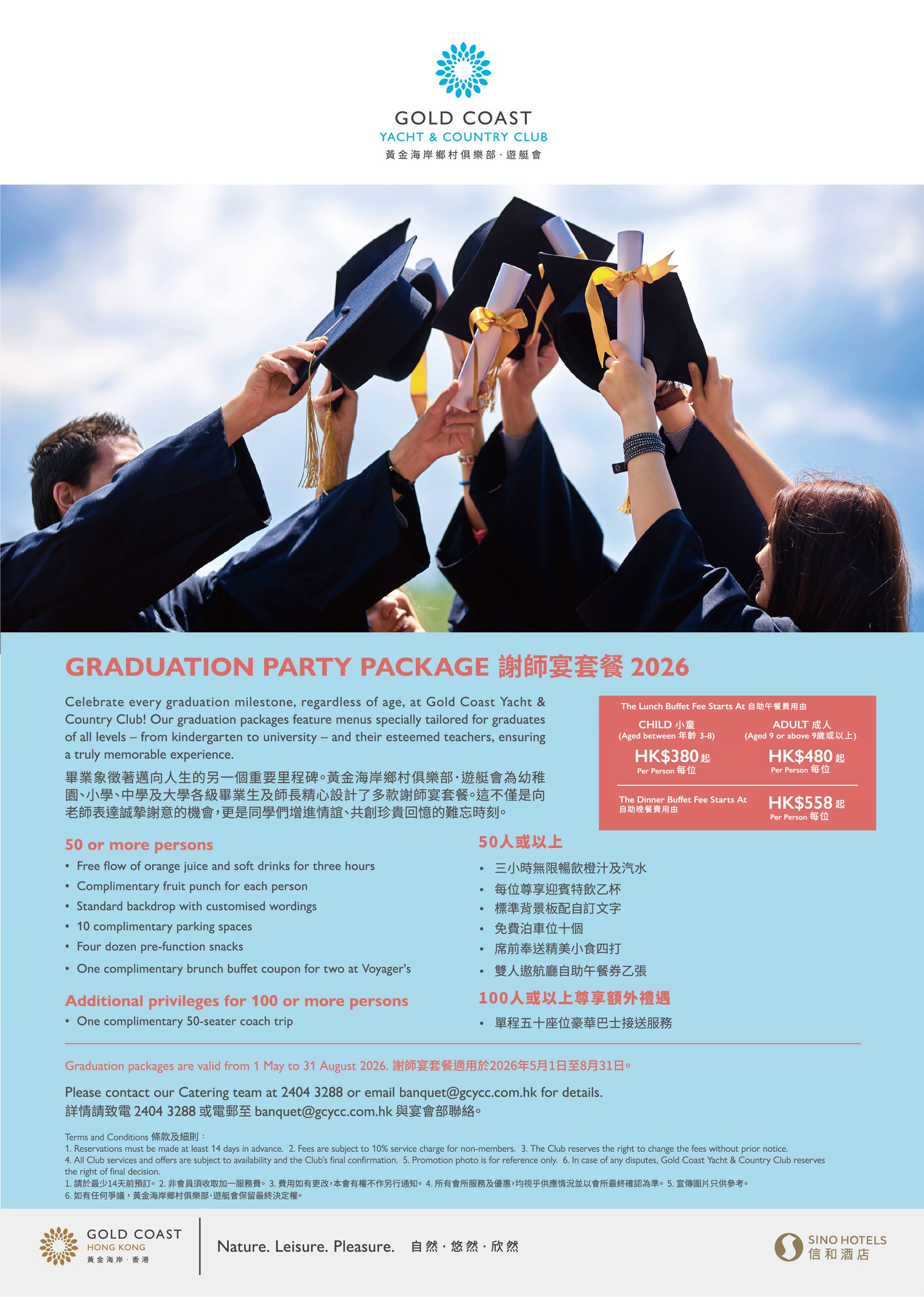 毕业象征着迈向人生的另一个重要里程碑。黄金海岸乡村俱乐部 • 游艇会精心设计多款谢师宴套餐供幼稚园、小学、中学及大学毕业生选择,让学生们借着聚会对老师昔日的教诲聊表谢意,更可增进同学间的情谊,留下难忘回忆。