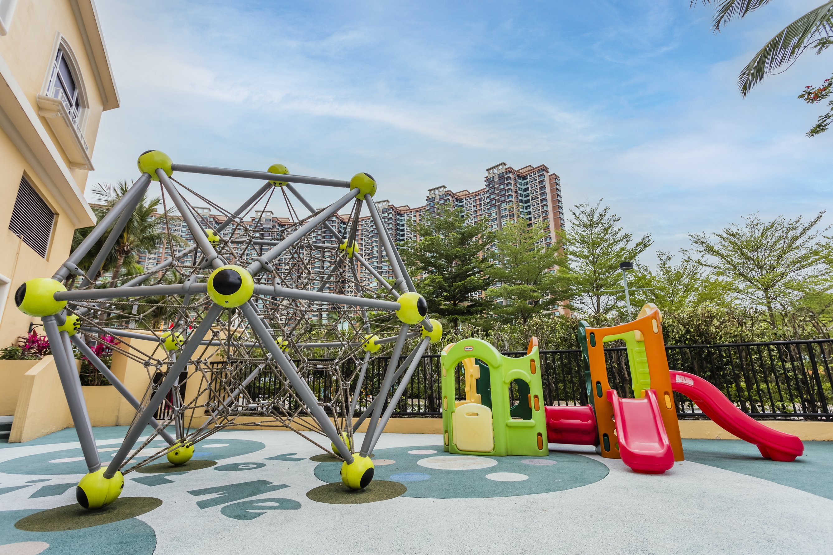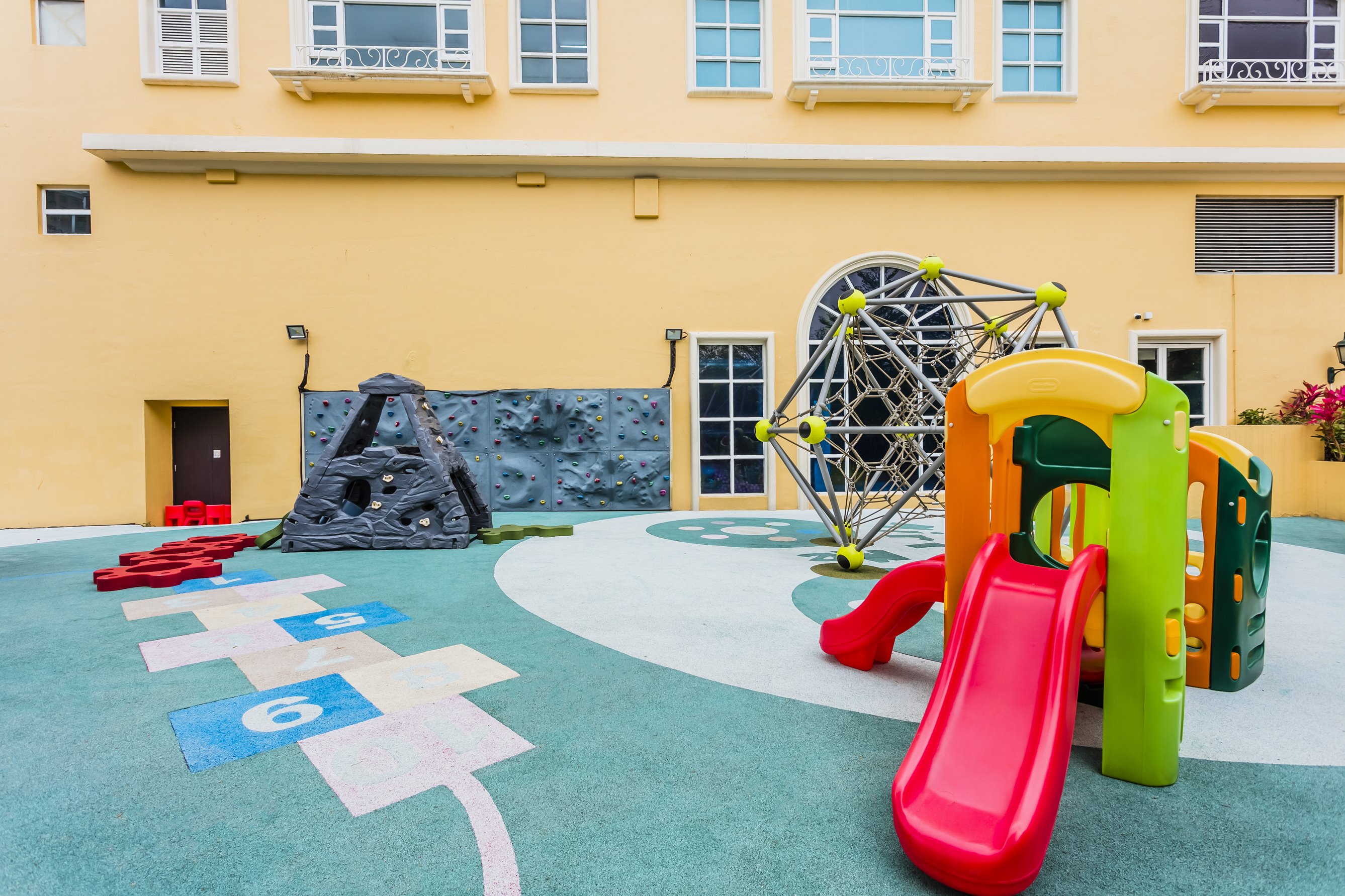 戶外遊樂場設有滑梯、繩網及小型攀石牆等遊樂設施,適合活力十足的 5-12 歲小童盡情玩樂。